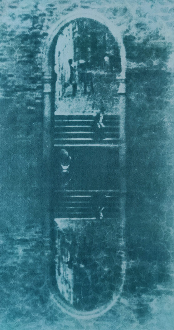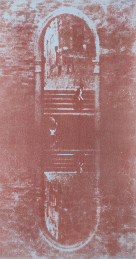 The images completed through several “resuscitation” processes were printed using locally purchased red (Rosso Venezia), green (Verde venezia chiant/Verde cromo oscuro), and blue (Blu cobaltino/Blu di prussia) pigments, utilizing one of the oldest photographic techniques from early 19th century known as Gum bichromate. The final color image “Phosphène (trichromie numérique)” was then created by scanning the red, green, and blue gum bichromate prints and digitally layering each image in a pseudo three-color decomposition process in order to rewrite “historical color and the light of Venice” from a contemporary perspective.
